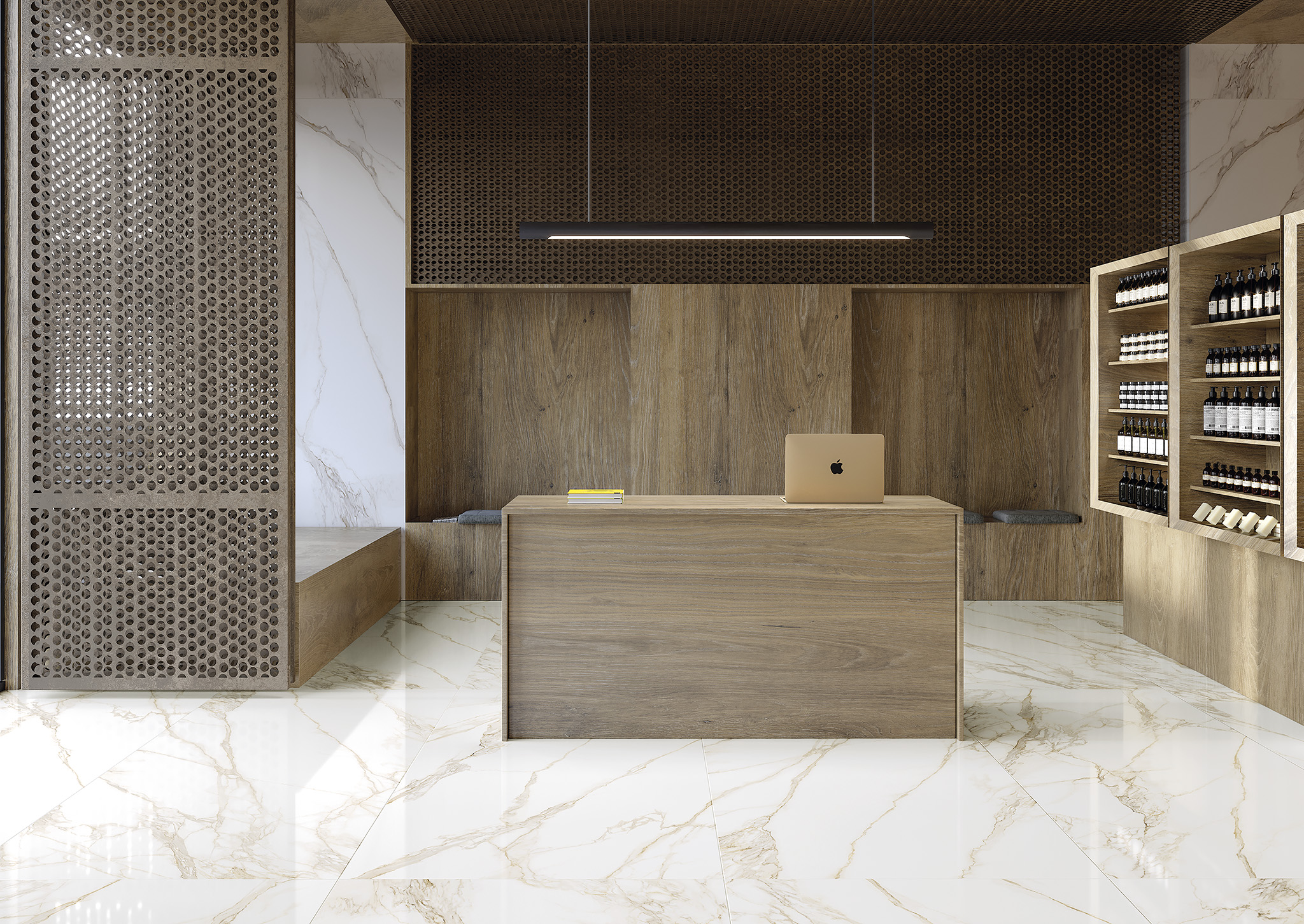 Ultra-white background and exclusive pattern, inspired by Calacutta marble.