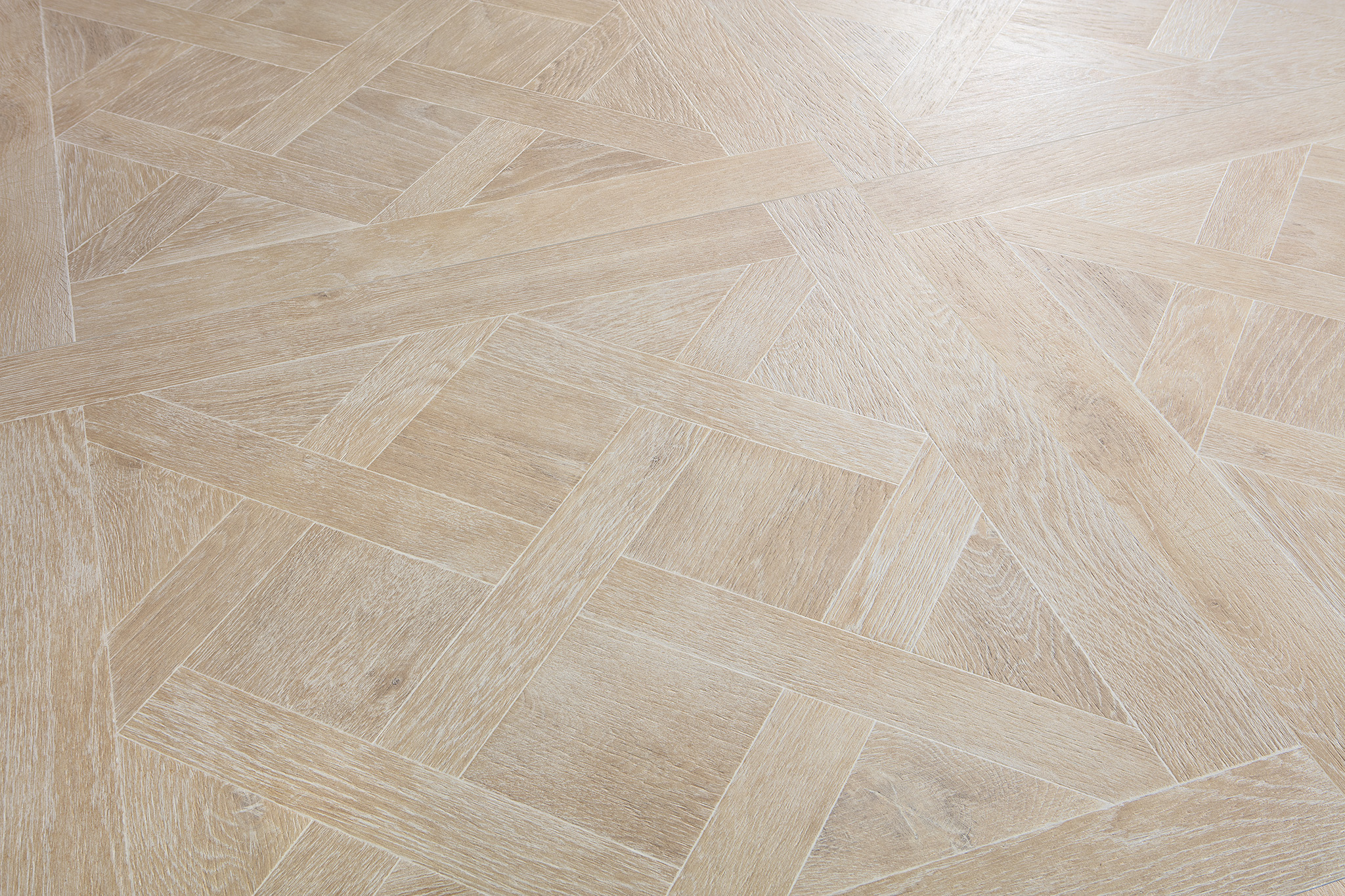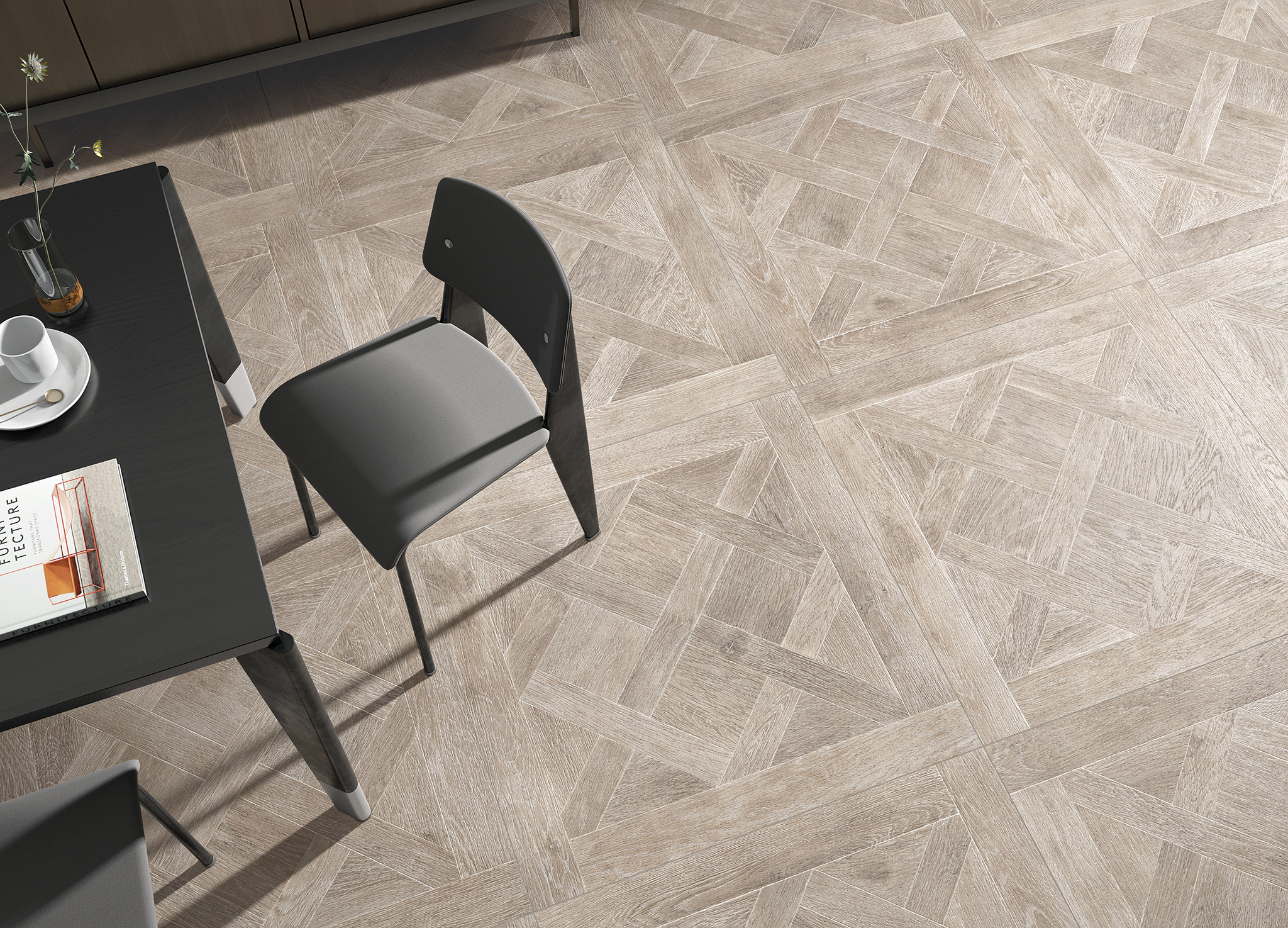 An oak wood-effect collection conspicuous for its timeless beauty, with a highly natural ‘Versailles’ marquetry pattern.