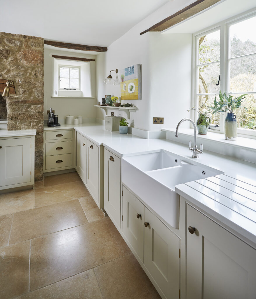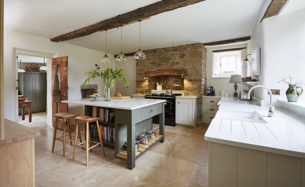 Working closely with bespoke kitchen company Barnes of Ashburton, Devon Stone supplied and installed a beautiful tumbled Calcot limestone floor to compliment the bespoke joinery created by Barnes of Ashburton at this 16th century Dartmoor farmhouse.
