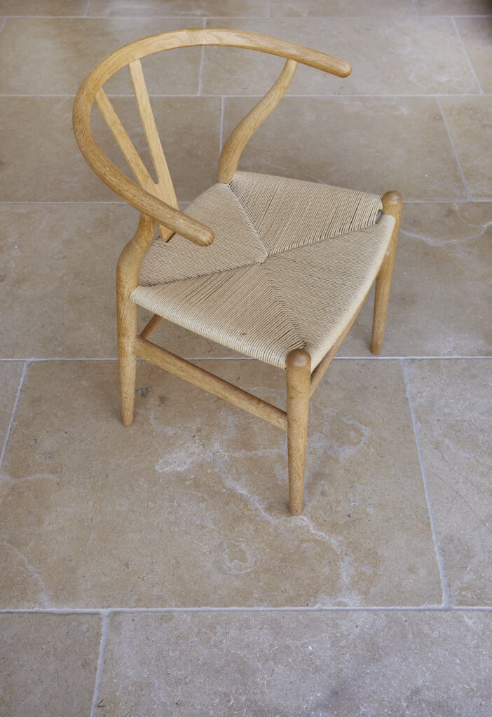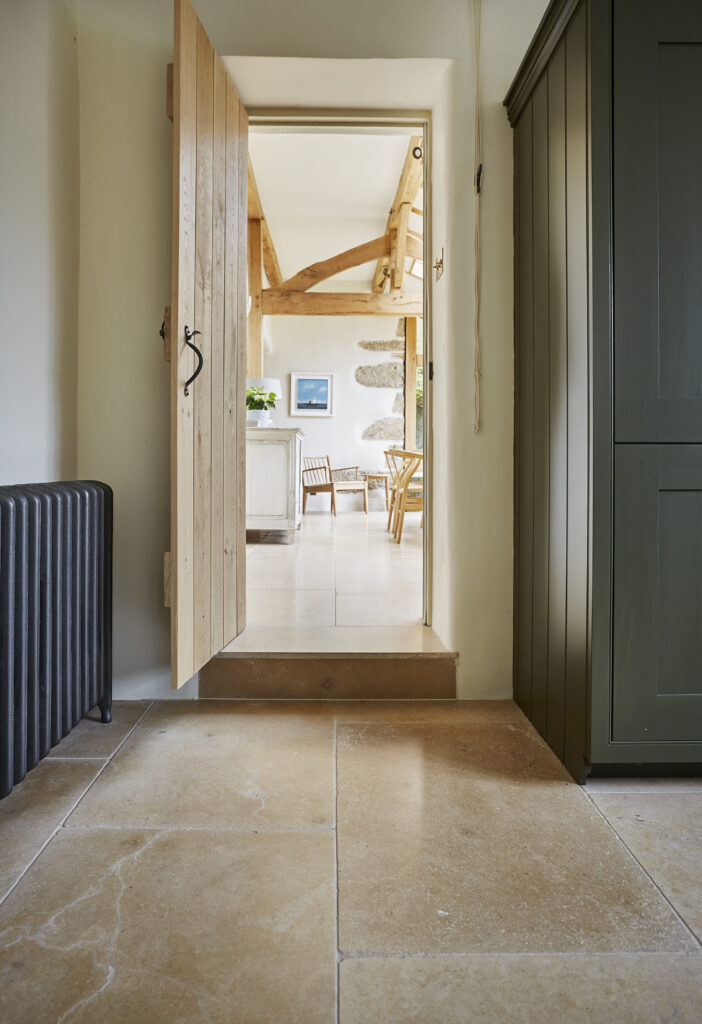 Chosen for its interesting surface texture, small fossil structure, and lightly tumbled edges our Calcot limestone worked to bring together the Dartmoor granite walls, oak structure of the dining room, and exquisite colours of the joinery.