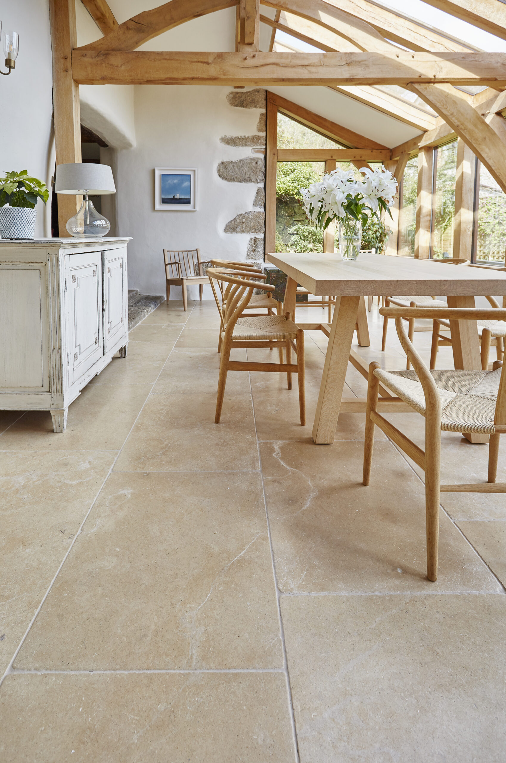 Chosen for its interesting surface texture, small fossil structure, and lightly tumbled edges our Calcot limestone worked to bring together the Dartmoor granite walls, oak structure of the dining room, and exquisite colours of the joinery.
